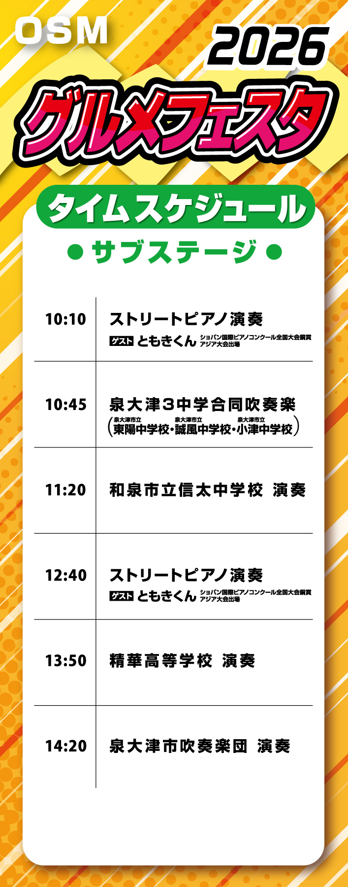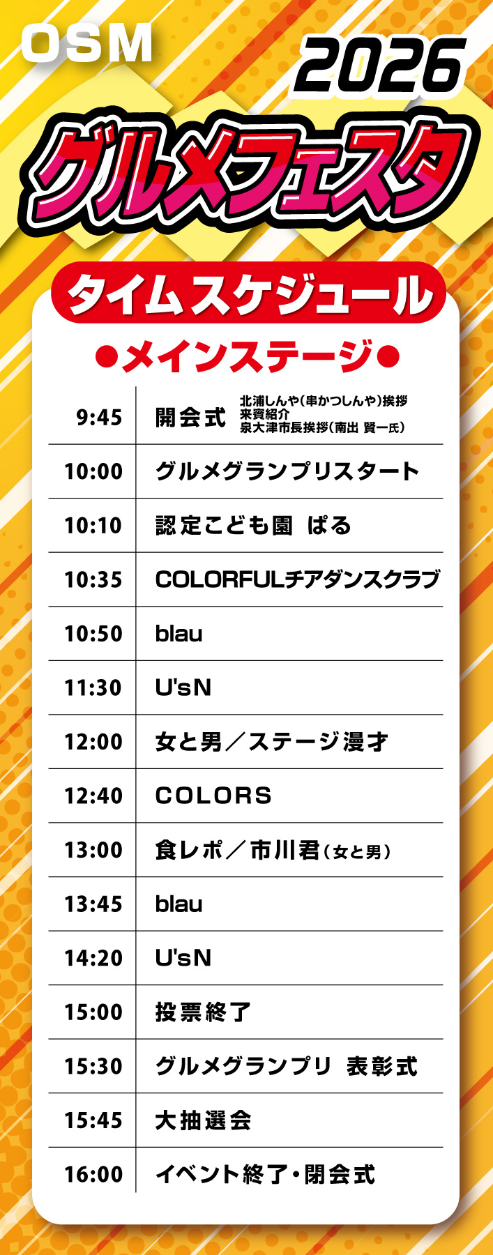 OSMグルメフェスタのスケジュールをアップしました。楽しいイベントがいっぱい!ぜひご参加ください。 ※スケジュール等内容は変更になる場合がございます。予めご了承ください。